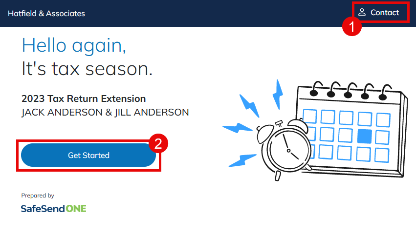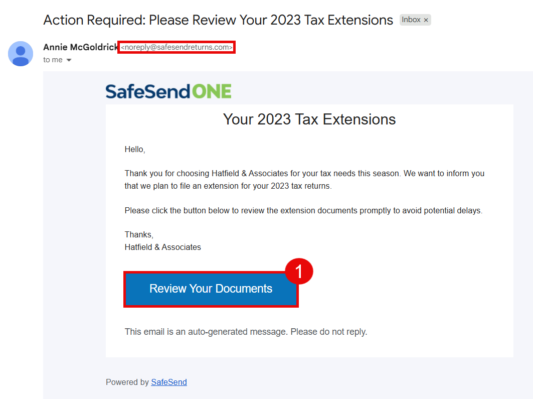 The taxpayer receives an email with a link to the extension package. All emails come from noreply@safesendreturns.com.