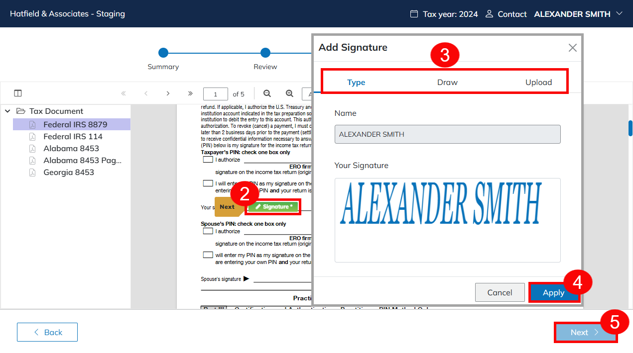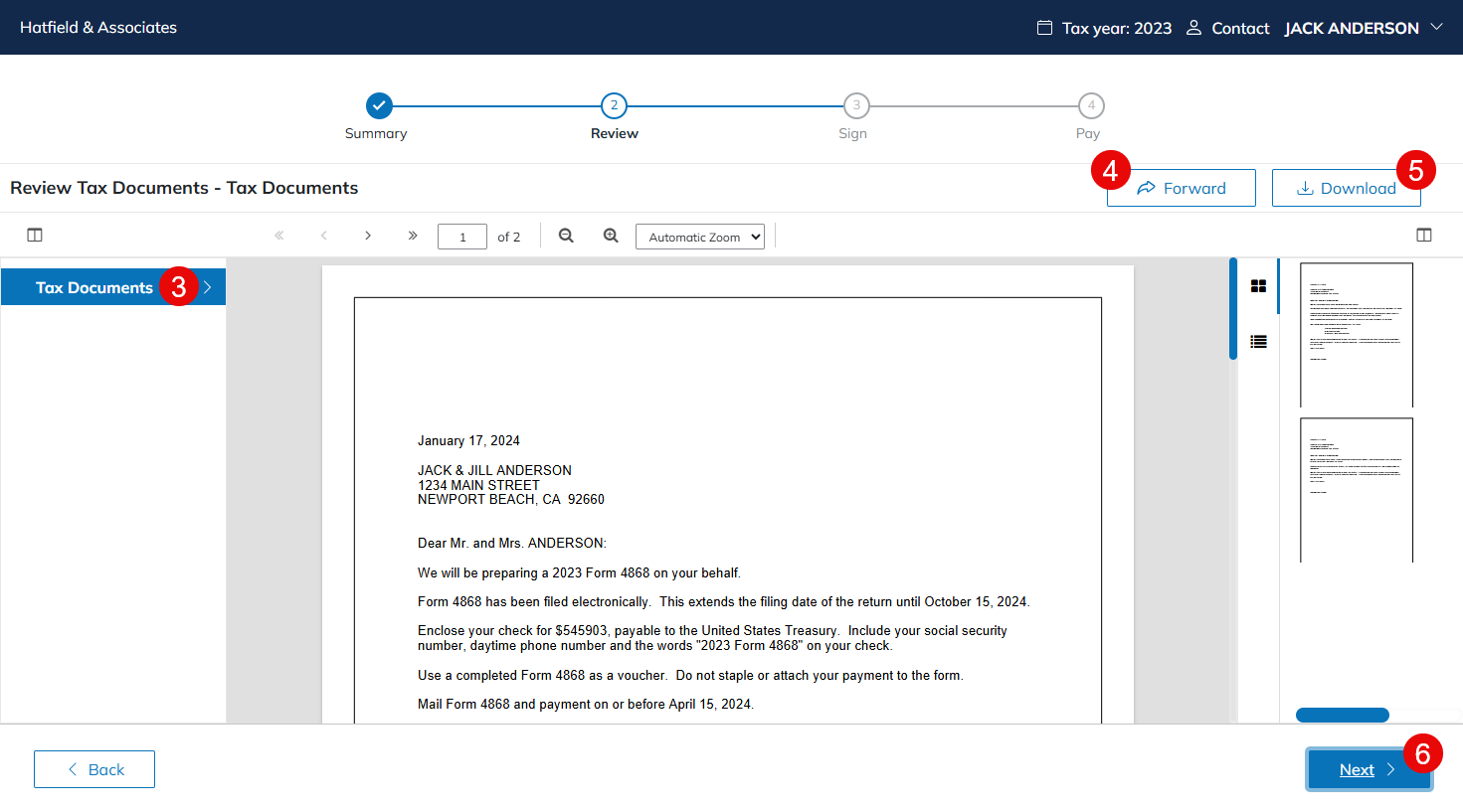 - Click View Tax or Forward Tax Documents to be taken back to the review step.