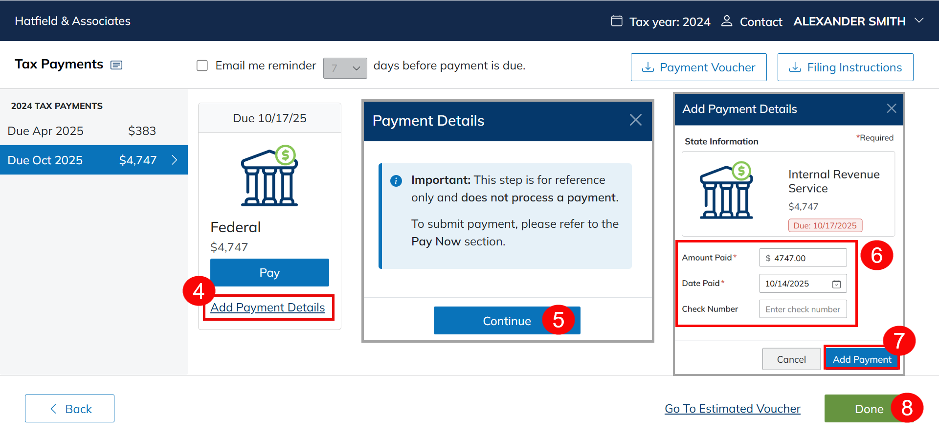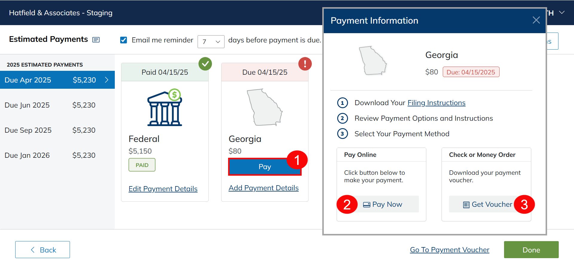 Estimated payments appear when you click Done. The options are the same for Tax Payment and Estimated Payments.