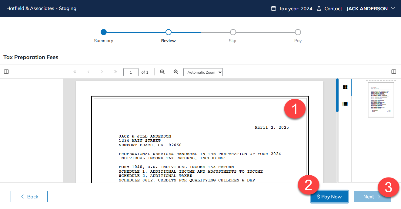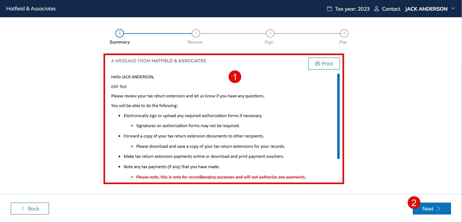 After the firm delivers an extension package, the client is notified via email. They can then click on a provided link to review their tax documents, make payments, and sign necessary forms. This article outlines the full taxpayer experience.