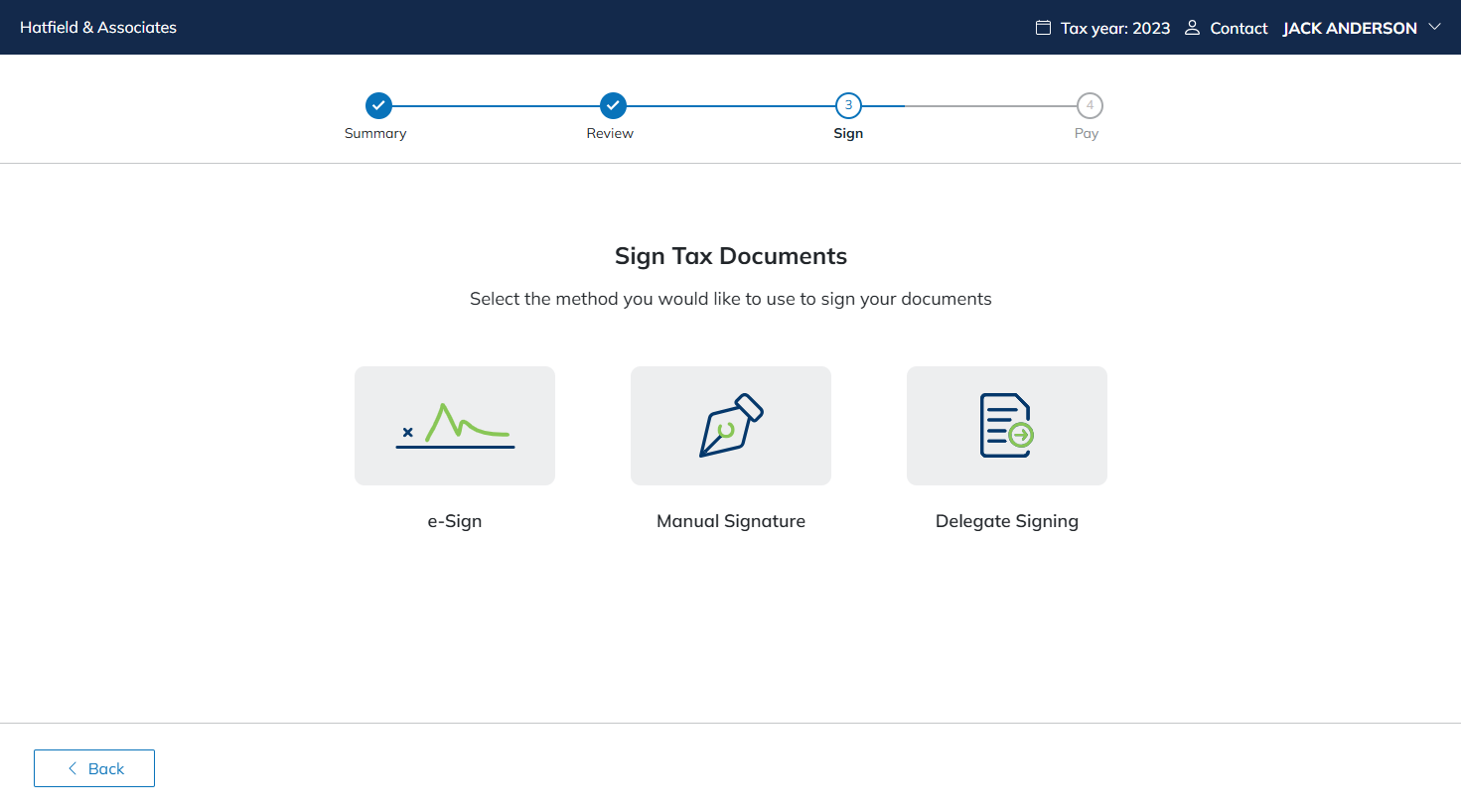 This screen shows the available ways that the client can sign required documents. Depending on the extension package and how the firm processed the extension, not all options may be available.
